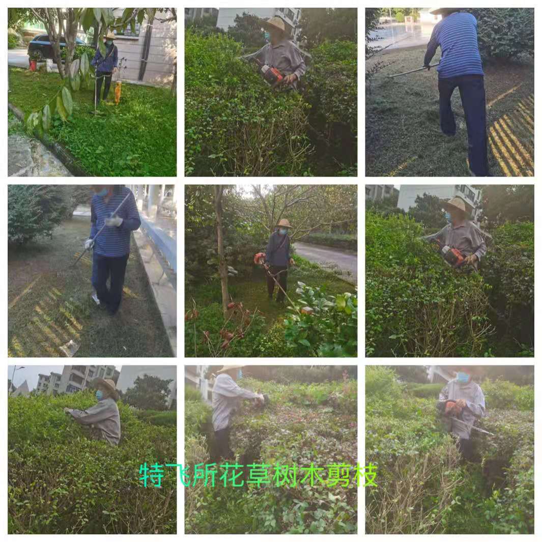 (圖為綠化保潔人員在小區(qū)內(nèi)修剪花?樹(shù)木)